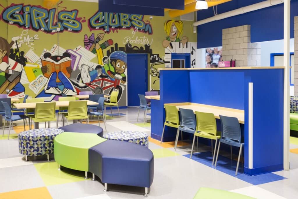 When a not-for-profit organization undergoes a major renovation and addition, it is important to get it right. Heather DeMoras Design Consultants worked with the Boys and Girls Club and Pardi Partnership Architects to provide an exciting interior finishes palette and cost-effective furniture that was both durable and dramatic. At the same time, this design was carefully considered to complement the architect’s vision and provide lasting value to this important Rochester institution.