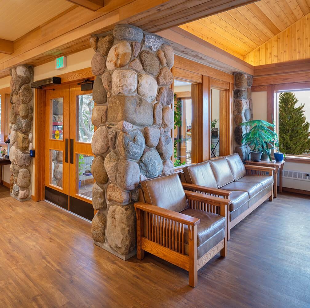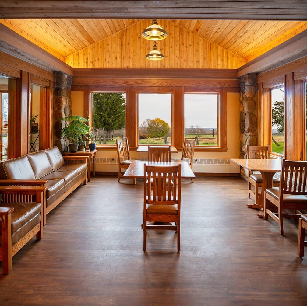 Throughout, natural materials such as stone and wood surround visitors with an experience rich in texture and warm tones. Vibrant signage helps tell the story of the Monks’ long history and provides a visual connection to the generations of devoted monks who have labored in the Genesee valley. New flexible lighting in the retail areas can be directed to highlight changing displays, and soft warm uplighting provides a cozy welcome in lounge areas and corridors.