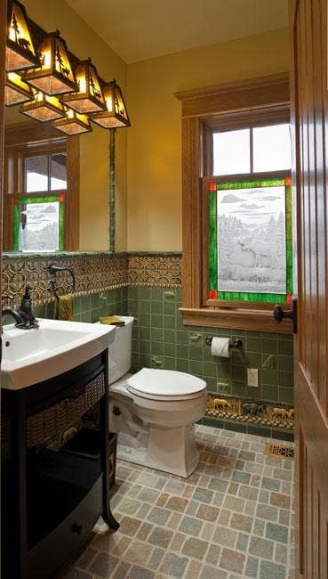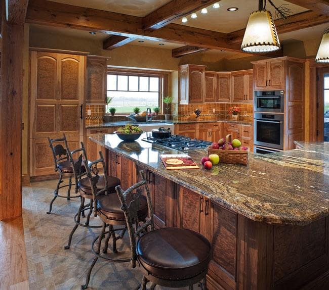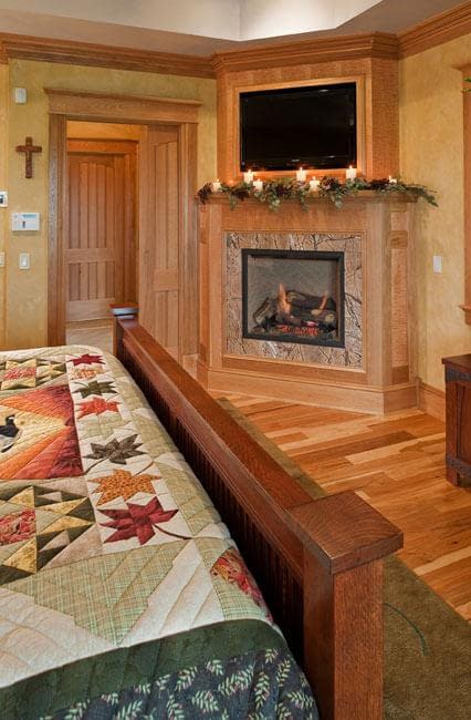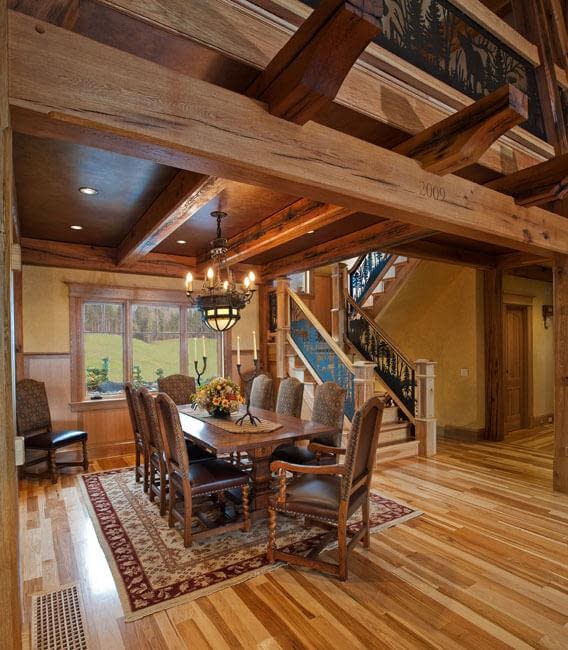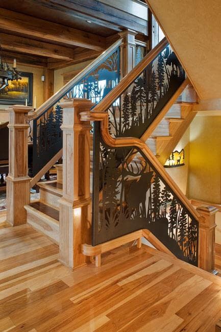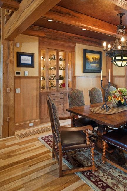 Interior details include ceiling fans with finishes and custom detailing to coordinate with the other custom lighting fixtures in the home. The Dining Room boasts a bronze moose chandelier above the dining room table. Along with custom furniture, other touches include a hand-stitched Mennonite quilt in the Master bedroom and murals by our decorative artist.