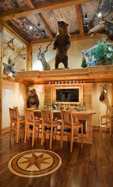 HDDC’s involvement touched on every aspect of the home, from the Kitchen and Trophy Room design to each of the guest baths and every room in between. Drawings and 3D visualization were produced for built-in details such as the massive fireplaces and their surrounding millwork, the trophy room with its world map ceiling and floor with inlaid compass rose, custom molding, trim & paneling throughout the house, and a master bath suite inspired by an Oak forest.