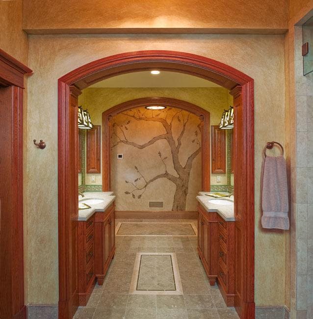 A home of this caliber requires attention to detail beyond simple finishes. Extensive tile designs highlight natural scenes and animals. Many portions of the home received artisanal paint effects to soften the scale and highlight architectural features. Artistic balustrades depict woodland creatures in forest settings. To ensure the continuity of the owners’ vision, we assisted in the selection of furniture and accessories and even assisted with the selection of windows and doors, exterior finishes, and custom exterior lighting fixtures.